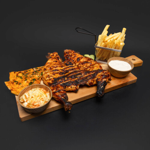 Halve kip bereid op de houtskool BBQ met een bakje coleslaw, saus, peterselie, ui en keuze uit patat, rijst of iraakse naan